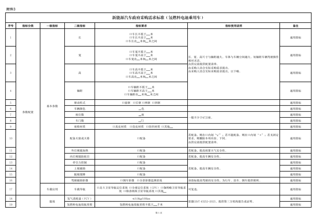 需求标准适用于新能源汽车政府采购项目,供采购人参考使用。意见稿中的新能源汽车是指纯电动汽车、插电式混合动力(含增程式)汽车、燃料电池(氢能)汽车。其中,氢燃料电池乘用车氢气消耗量(FCV)≤0.9kg/100km,其他需求标准如下: